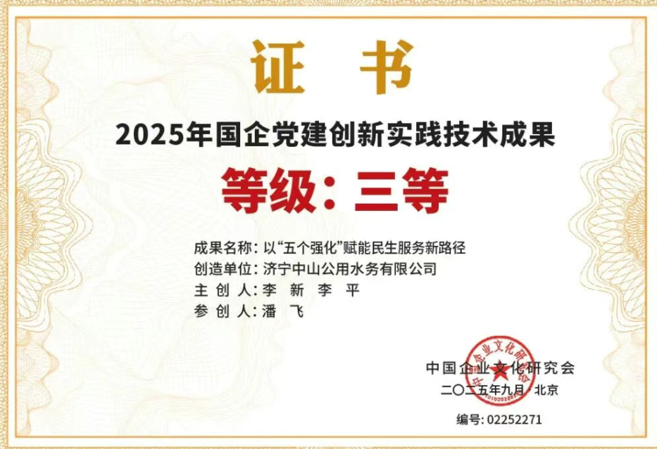 喜報(bào)!濟(jì)寧中山公用水務(wù)黨建案例榮獲“2025年國企黨建創(chuàng)新實(shí)踐技術(shù)成果”三等獎(jiǎng)